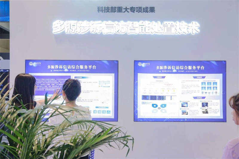 走进西政智慧司法展区,首先看到的就是展台正中的科技部重大专项成果——多源涉诉信访智能处置平台。