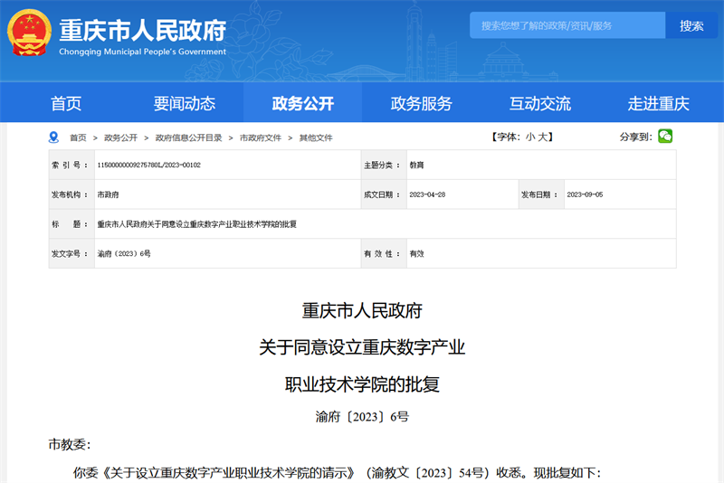 9月5日,重庆市人民政府发布了《关于同意设立重庆数字产业职业技术学院的批复》,同意设立重庆数字产业职业技术学院,该院定位为专科层次的高等职业学校,办学地点在重庆市忠县复兴镇,全日制在校生规模暂定为6000人。