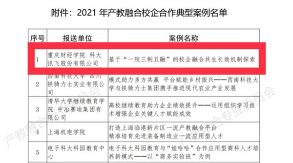 重庆财经学院《基于“一院三制五融”的校企融合共生长效机制探索》成功入选中国教育发展战略典型案例,在485个案例中位列第1。