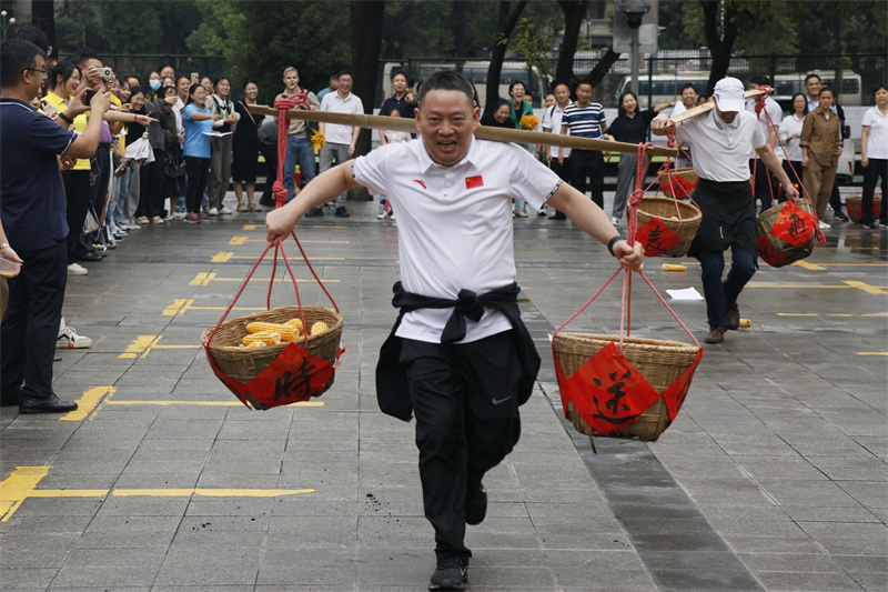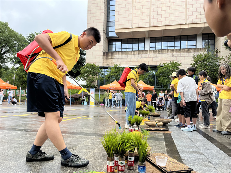 “春种秋收”活动中,学生队和教师队两支队伍轮番参与合作接力游戏,队员们必须快速穿越场地,开展土壤运输、播种、插秧、浇灌、施药等耕作环节,将春播秋收、春华秋实浓缩在接力过程中,场面热闹非凡。