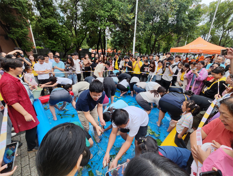 “浑水摸鱼”是模拟水稻秋收后,大家在稻田里抓“稻香鱼”的场景,参赛队员要徒手抓住“滑不留手”的泥鳅和鲤鱼,然后迅速递到场外的水桶内——泥鳅加2分,鲤鱼加1分。偶尔脱手的鲤鱼飞跃至空中,惊起一片尖叫,现场欢声笑语不断。