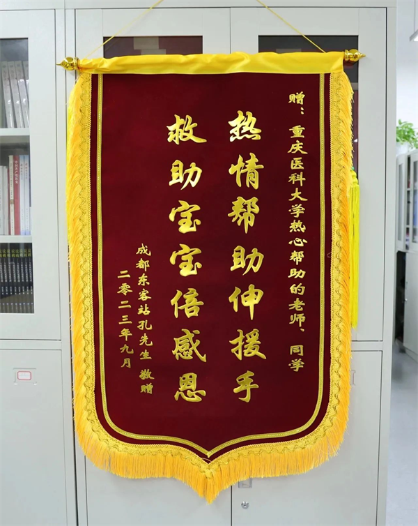 10月8日,重庆医科大学收到了从成都寄来的一面锦旗,但锦旗没有具体的收件人,寄件人孔先生只记得帮助他的两位女孩背着印有“重庆医科大学”字样的背包。