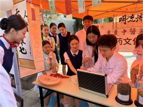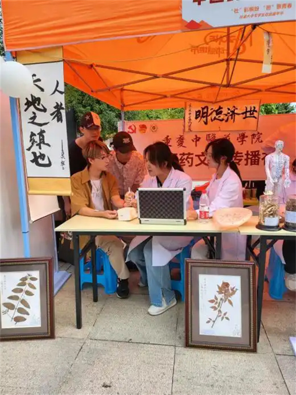 活动现场,重庆中医药学院中医药文化传播社展台旁人潮涌动,大家争先恐后前来排队体验。