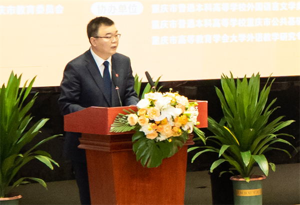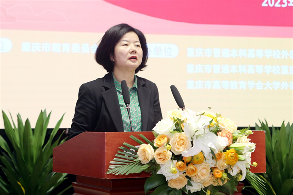 中国英汉语比较研究会会长、重庆市外教指委主任、四川外国语大学校长董洪川教授为大赛致欢迎词。重庆市外教指委副主任、重庆市外文学会会长文旭教授、外语教学与研究出版社西南大区总经理王海燕女士致辞。重庆市教育委员会副主任蒋云芳在开幕式上讲话。她对本次大赛提出了以下三点建议:第一,坚持“育人为本”,注重发挥大赛对“三进”教育教学成效的检验功能;第二,坚持“以赛促建”,注重发挥大赛对高校外语教育教学改革的促进功能;第三,坚持“互学互鉴”,注重发挥大赛对外语人才培养经验成果的展示功能。