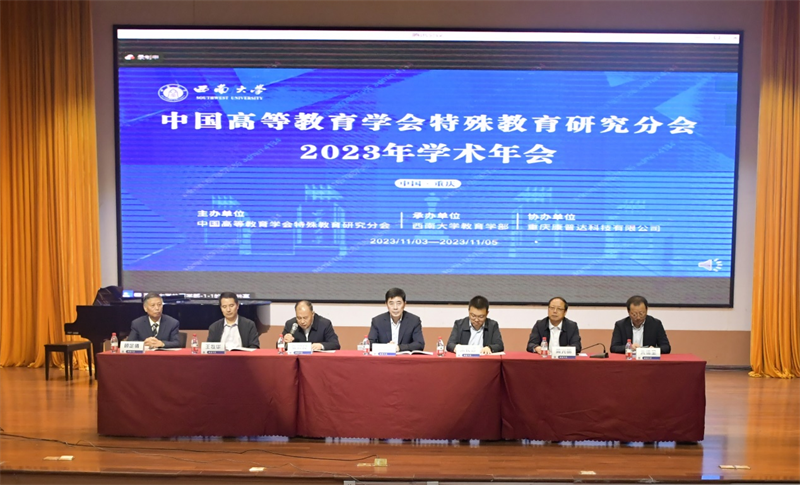 2023年11月4日,中国高等教育学会特殊教育研究分会2023年学术年会在西南大学演奏厅顺利召开。特殊教育是我国教育事业的重要组成部分,是建设高质量教育体系的重要内容,也是衡量社会文明进步的重要标志。本次年会聚焦“落实党的二十大精神,推进我国特殊教育高质量发展”主题,来自全国70多所高校以及27所特殊教育学校、康复机构的近400名特殊教育工作者共聚西南大学参与本次学术年会,同时,大会通过线上直播观摩开幕式和主旨报告,共同分享、探讨特殊教育的高质量成果。大会由中国高等教育学会特殊教育研究分会主办,西南大学教育学部承办。