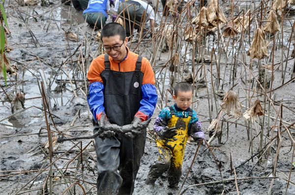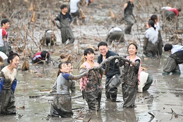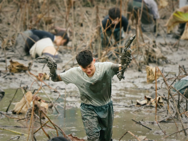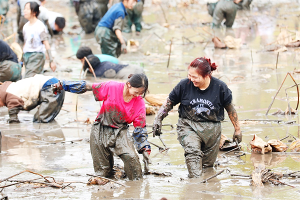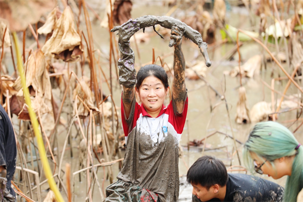 往日优美的荷塘,少了许多闲适,多了许多艰辛;平日步伐矫健的师生,少了许多轻盈,多了许多“狼狈”。采藕过程中,师生们不畏池水冰冷,即便深陷泥地、全身湿透、双手划伤,也依然坚毅前行,只顾感受每一节藕被艰难刨出时发自肺腑的刹那喜悦。从荷塘一角到遍布四方,池水不再冰冷、泥塘不再深陷,岸边观众的一杯杯姜茶、一幕幕接引是最贴心的陪伴;从满心期待到初次尝试、从步履维艰到熟能生巧,劳动过后的不再是疲惫与辛酸,而是通力合作熊熊燃烧的团魂。移通师生在淤泥的羁绊中用真情实感传递出劳动的温度,用钢铁般的意志铸就了专属于移通人的“劳模”精神。