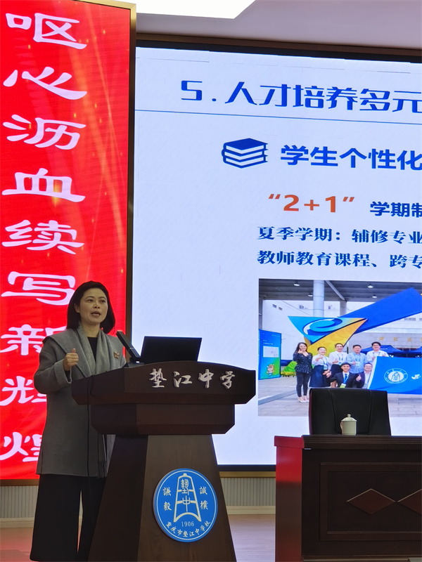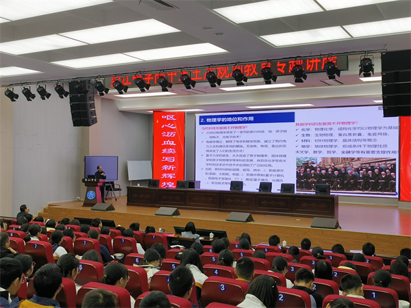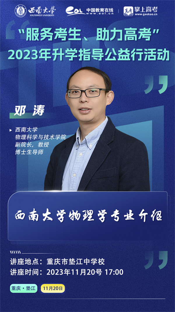 11月20日下午,西南大学招生就业处副处长谭玲玲,西南大学物理科学与技术学院副院长、教授、博士生导师邓涛,走进重庆市垫江中学学术报告厅,与该校400余名高一学生面对面交流。谭玲玲详细介绍了西南大学的基本情况、专业特色、招生计划、注意事项等,让同学们对于高考报考有了更加全面的认知。邓涛教授从西南大学物理学专业的角度,介绍了学校的科研实力和未来就业方向等信息,让同学们感受到了西南大学的影响力以及物理学的魅力。过程中同学们专注听讲,不时掌声雷动。