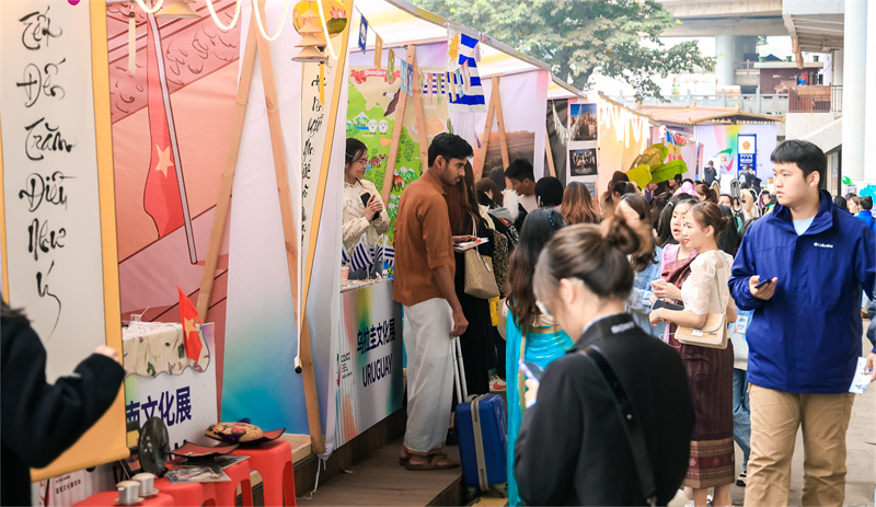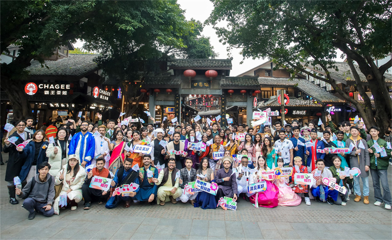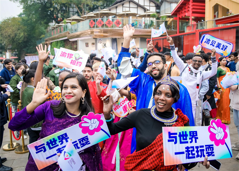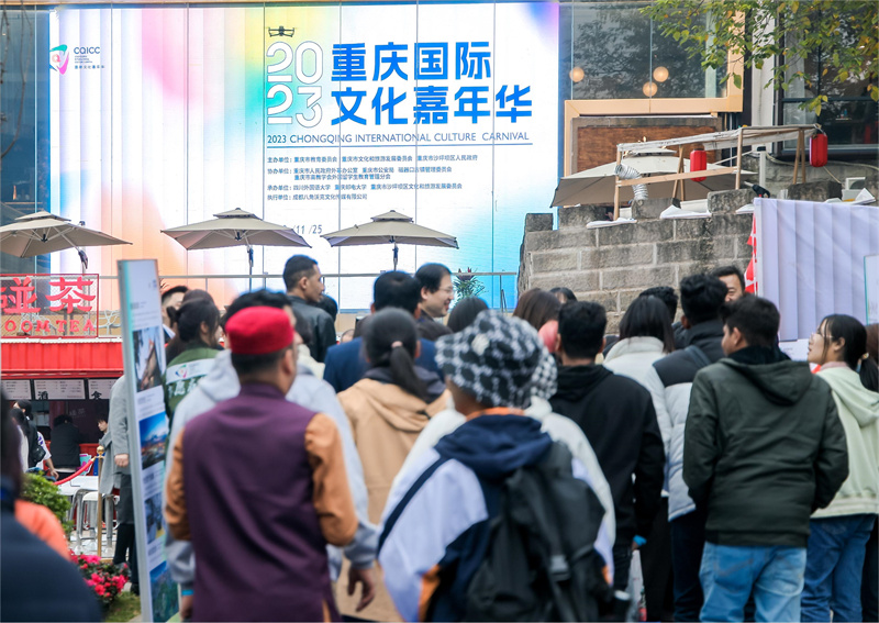 11月25日,2023重庆国际文化嘉年华活动在前年古镇磁器口古镇后浪广场成功举办。来自40多个国家的1000余名成渝高校中外青年学生参加活动。
