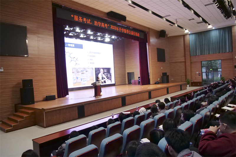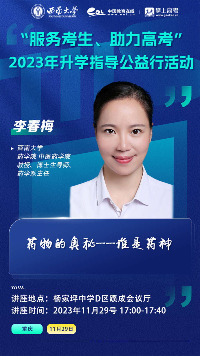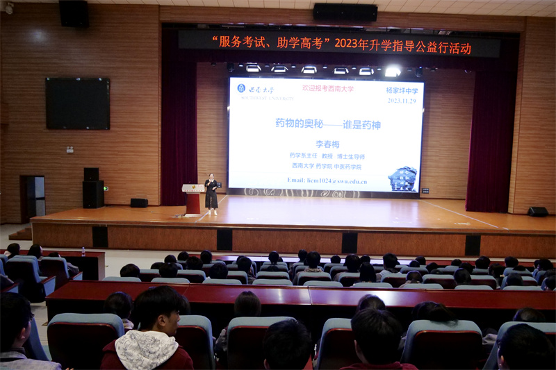 11月29日下午,西南大学招生就业处副处长谭玲玲,西南大学药学院中医药学院教授、博士生导师、药学系主任李春梅,来到重庆市杨家坪中学D区蹊成会议厅,为同学们科普“药物的奥秘”。