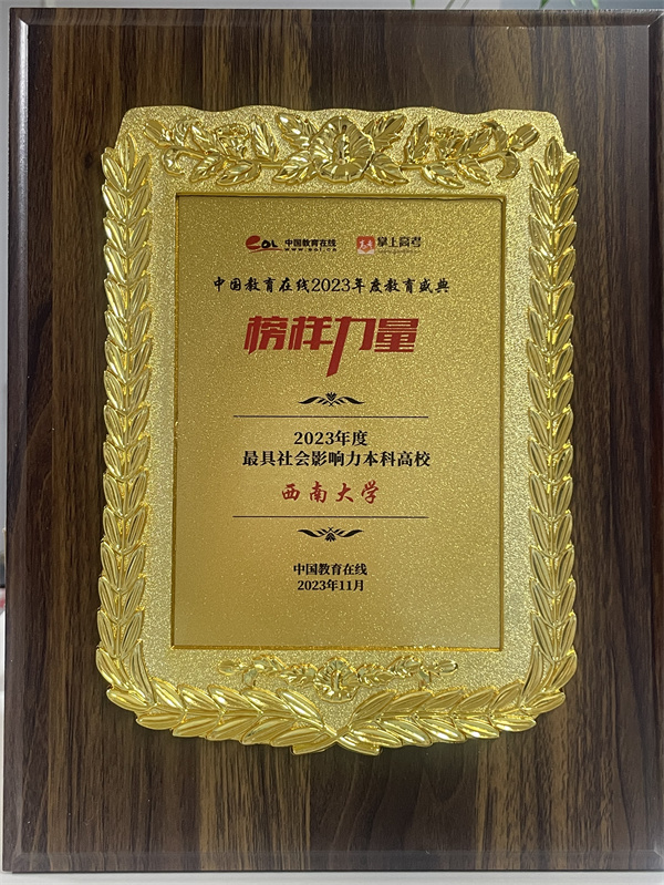 近日,必威体育登录网址 “榜样力量·2023年度教育盛典”评选获奖名单揭晓,在本次评选活动中,西南大学凭借卓越的品牌影响力和办校实力,深厚的学术积淀,荣获“2023年度最具社会影响力本科高校”的称号。