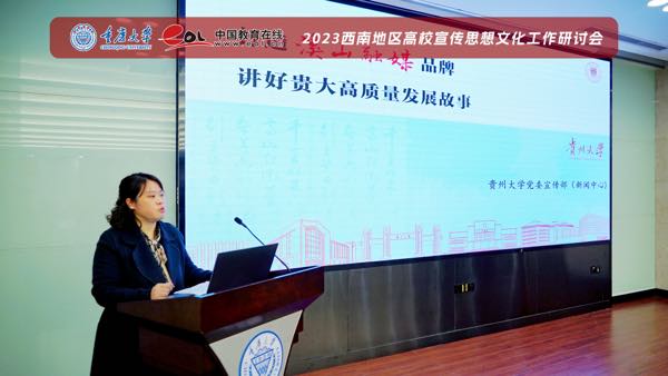 贵州大学党委宣传部网络宣传科科长韩晓梅以“打造‘溪山融媒’品牌 讲好贵大高质量发展故事”为主题,介绍了贵州大学如何着力建设贵州领先、西南一流、全国知名的高校校媒样板。韩晓梅表示,贵州大学校院两级目前有通讯员、网评员、联络员“三员”队伍 1500余人,重组学生记者团共8个分团300余人,建设了“一报一网”、“两台四微多端”的媒体矩阵,利用数智化的融媒体平台系统,生产出大量优质的宣传内容,多次获得各类奖项和荣誉。