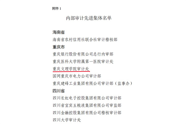12月1日,中国内部审计协会下发《中国内部审计协会关于表彰2020年至2022年内部审计先进集体和先进工作者的决定》(中内协发[2023]65号),重庆文理学院审计处获评“2020至2022内部审计先进集体”。