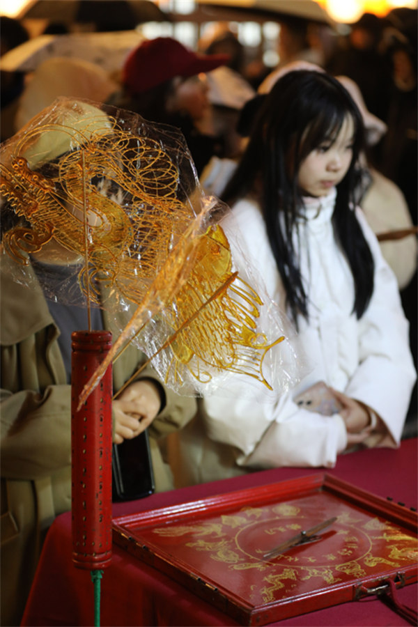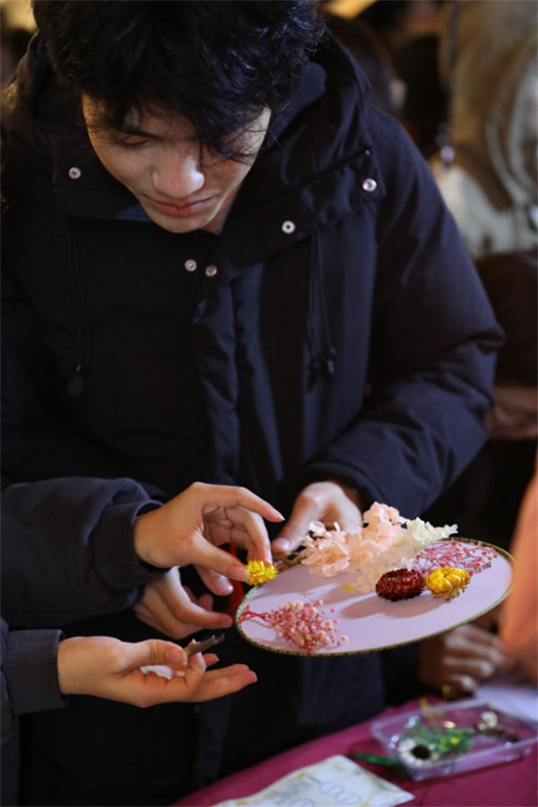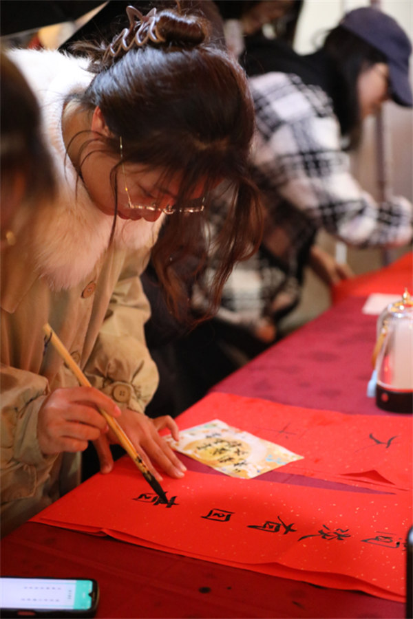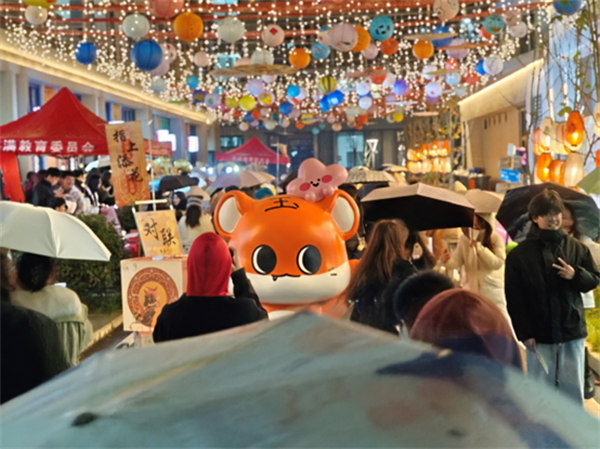 活动体验区设有对联区、团扇DIY区、糖画区等多元的传统文化互动环节,吸引不少人打卡游玩。漫步在灯海之下,师生们三五成群,聊笑打趣,仿佛穿越古今,又回到了千年以前的大唐夜宴。