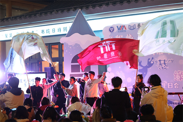 寿星师生结伴登场并佩戴专属手环,来自陌生伙伴的一声声生日祝福接踵而至,大家齐聚一堂,共同感受书院魅力。重庆綦江来自书院的第一场雪如诗如画,悠然飘落,舞动着冬日浪漫。寿星们在舞蹈中热情回应;歌曲表演激情澎湃,点燃全场;乐队演出犹如青春般充满活力,生生不息;一张张“顶呱刮卡”揭开年度的连绵好运……表演结束后,师生共同分享蛋糕,频频相视欢笑,寿星们在灯笼上写下了美好祝愿,并悬挂在这棵来自合川大石的百年黄桷树上,将心愿和祝福高高举起,祈求来年平安健康,万事顺意。