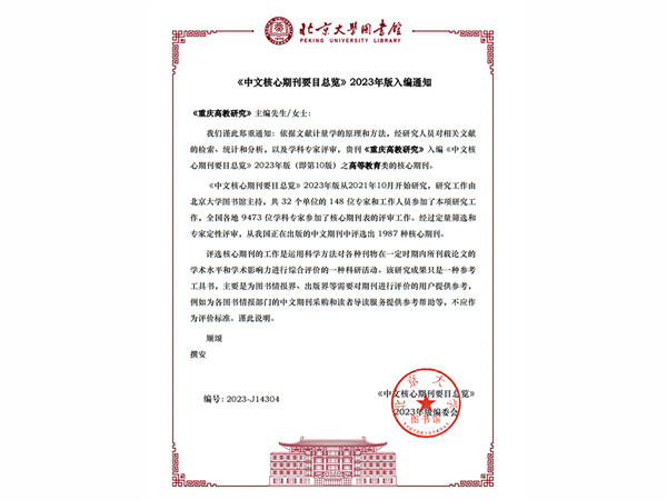 近日,北京大学图书馆编制的《中文核心期刊要目总览》2023年版(即第10版)正式发布,重庆文理学院和重庆市高等教育学会联合主办的《重庆高教研究》继第9版入编后,再次入编“高等教育类”核心期刊。