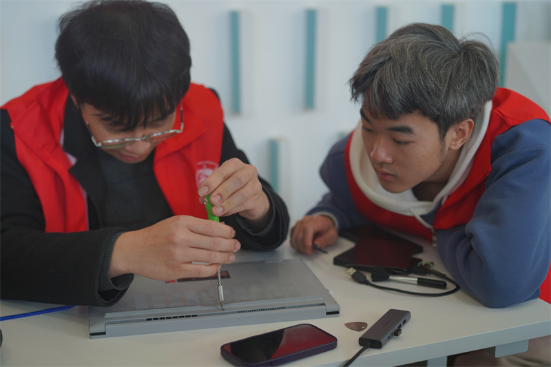 “我这个电脑用了3年卡得不行,志愿者不一会就帮我重装好了系统,现在就跟新的一样”,志愿者们热情细致的服务赢得同学们一致好评。2022级计算机科学与技术专业的志愿者吴军霖现场打起“广告”:“平时同学们还可通过我们‘及时雨’公众号在线预约,我们还能进寝室为大家免费提供上门服务”。