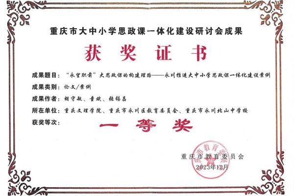 习近平总书记指出,“思政课的政治性、思想性、学术性、专业性是紧密联系在一起的,其学术深度广度和学术含金量不亚于任何一门哲学社会科学!”学校高度重视对思政课内容与教学的研究,尤其注重深入研究马克思主义中国化时代化理论成果,重点研究习近平新时代中国特色社会主义思想,着力深化党的创新理论体系化研究、学理化阐释,引导教师把思政课教学建立在深厚的学历基础之上,以理论上清醒保证政治上坚定。教师先后获重庆市社会科学优秀成果奖、全国学校共青团研究成果奖、重庆市大中小学思政课一体化建设研讨会成果奖、重庆市教育科学研究优秀成果奖等系列奖项数十项。