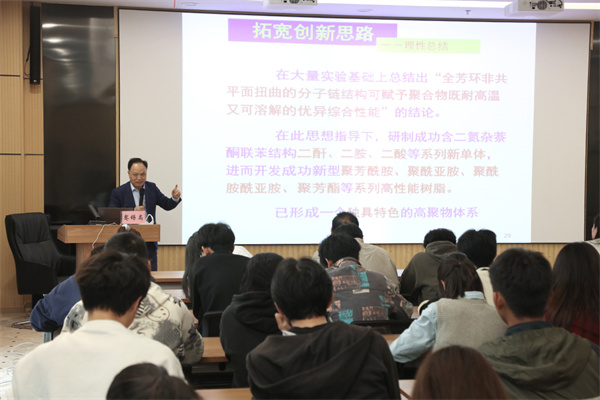 蹇锡高院士还应邀参观了学校科技创新中心及部分实验室,并为我校材料科学与工程学院师生作了题为“材料科技创新引领产业革命——我国塑料产业现状分析及发展趋势展望”的主题报告。报告中,蹇锡高院士从高性能高分子材料及复合材料在航天航空等领域的重大应用出发,结合高分子材料2035发展战略研究报告,以问题为导向,分析了传统高性能工程塑料存在的问题,阐述了其技术创新思路,讲述了根据材料性能需求开发结构全新的单体,进而开发全新的聚合物的过程,理性总结了拓宽创新思路的经验,并对我国塑料产业作出发展趋势展望,指引学科专业建设。
