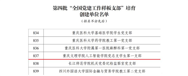 近日,教育部办公厅公布第四批全国党建工作示范高校、标杆院系、样板支部培育创建单位名单,重庆文理学院数学与人工智能学院学生第一党支部(原人工智能学院党总支学生第一支部)入选全国党建工作样板支部培育创建单位。