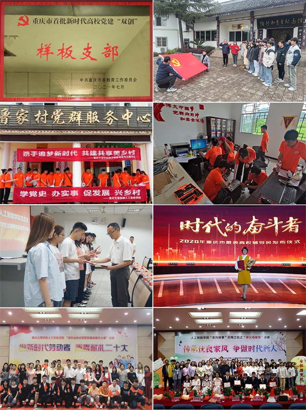 数学与人工智能学院学生第一党支部师生党员33名,是全市首批新时代高校党建“双创”工作样板支部。支部严格对照样板支部“七个有力”培育创建目标,坚持“一融双高”理念,以立德树人为核心,以环境育人为先导,构建“111227”党建工作体制机制,实施学生党员发展教育管理“123456素质提升工程”和人才综合培养“四大工程”,成功探索出党建与人才培养及事业发展深度融合,以高质量党建助推学院高质量发展的示范案例。支部有5名教师党员获得市级以上表彰,其中一名教师党员获全国高校辅导员年度人物入围奖;有60余人次学生党员获得市级优秀毕业生、国家奖学金、“互联网+”创新创业大赛全国金奖等市级以上奖励或表彰;先后孵化出重庆永爱科技有限公司等19个学生微型企业;成功申报各类科技创新创业项目100余项。先后有西华师范大学等20余个高校二级院系前来参观交流。相关经验入选全市党建工作样板支部创建特色案例。支部开展的“六个一”特色党课受到重庆卫视专题报道,党建品牌影响力逐渐增强。