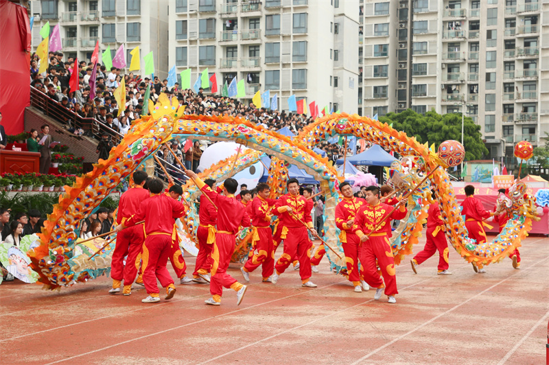 学校体育和大健康学院的花车为龙舟造型,顶部为传统建筑屋顶样式,头部和前部饰以波浪和锦鲤,同学们更是带来了精彩的舞龙舞狮表演,引来阵阵掌声。
