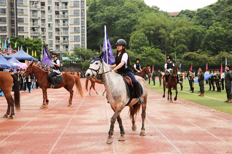 开幕式上最后一个方阵是学校国际教育学院的马术方阵,他们带来了精彩的马术表演。在马术方队表演过后,“铲屎官”们紧随其后清理现场,令人忍俊不禁。