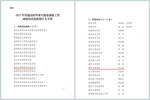 重庆文理学院在2023年重庆市普通高校毕业生就业创业工作中获表彰