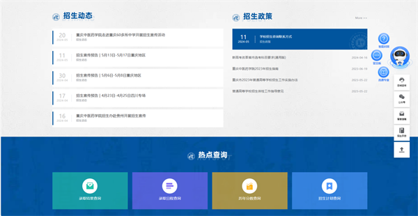 为帮助考生和家长全面获取学校招生信息,重庆中医药学院各大招生咨询平台全面开通,搜索“重庆中医药学院”或进入官方网站(https://www.cqctcm.edu.cn/),网站涵盖报考指南、学科专业、招生政策等多个板块,还有智能小助手在线解答考生的问题,帮助考生和家长深入了解学院办学特色、专业优势、教学实力和招生动态,为考生顺利报考提供有力支持。网站还设置了“招生就业”板块,旨在为考生提供更全面、更有针对性的招考信息。