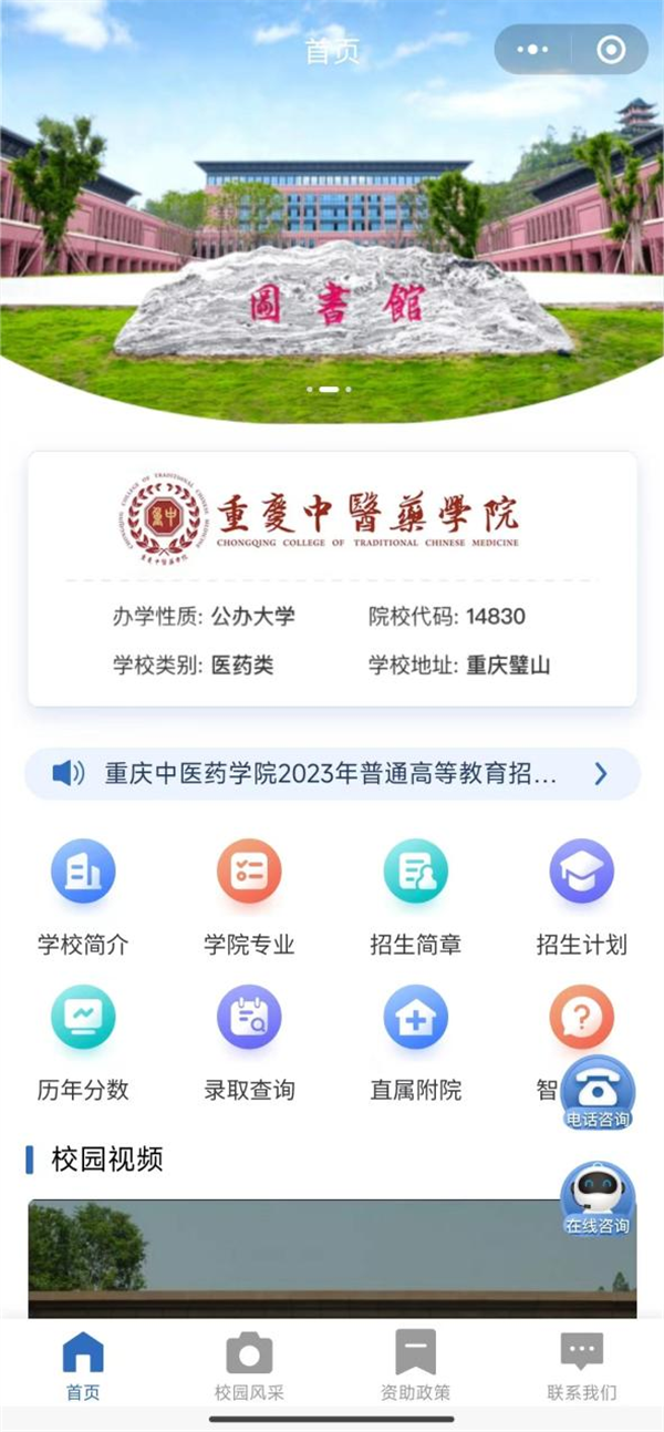 考生和家长可以通过微信搜索“重庆中医药学院本科招生小程序”。小程序设有学校概况、专业介绍、宣传视频、招生计划、历年分数、报考指南、在线咨询等版块,考生可借此全方位地了解学校招考动态、在线咨询等各种报考问题。