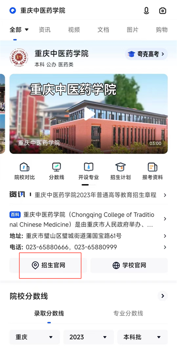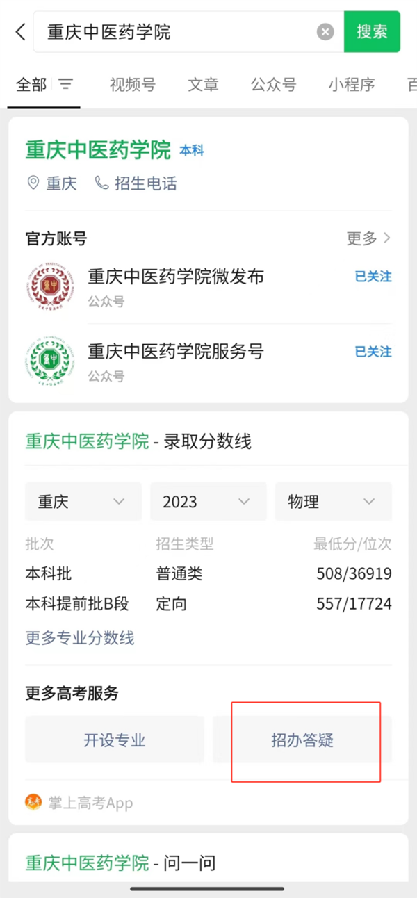 通过百度、360搜索、夸克、掌上高考APP等平台搜索“重庆中医药学院”,考生和家长可以看到查询入口,解锁智能解答、在线咨询等功能,获取招考信息。