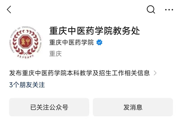 此外,考生和家长还可以搜索“重庆中医药学院微发布”微信公众号,依次点击“关注—发消息—校内查询—本科招生”获取最全面的招生资讯。