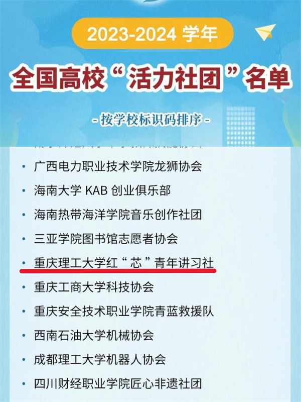 近日,由共青团中央基层建设部指导,中国青年报社主办的2023—2024学年全国高校“活力社团”评选活动结果出炉,重庆理工大学红“芯”青年讲习社从3000余所高校十万余社团中脱颖而出,被评为全国高校百强“活力社团”。