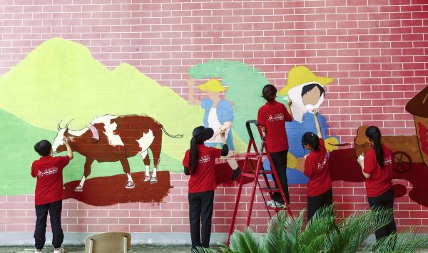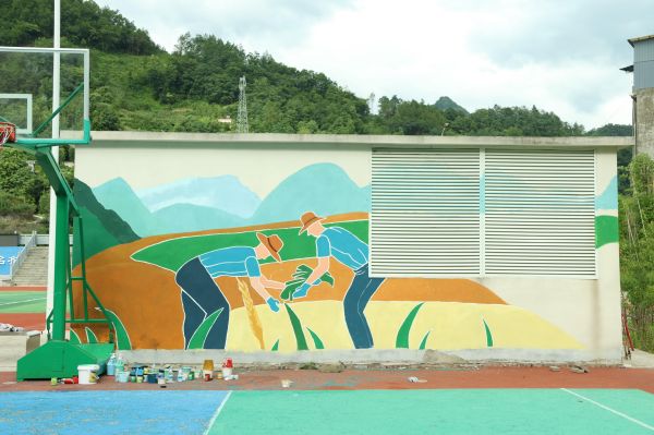 近日,城口县修齐镇第一中心小学的校园面貌焕然一新,曾经单调的校舍墙画摇身一变成为了红色文化、农耕文化的生动教材,这是西南大学美术学院“三下乡”文化艺术服务团,创作的百余平地域文化主题墙绘。除了川陕革命根据地城口苏维埃政权纪念公园等代表性地标,“春耕、夏耘、秋收、冬藏”等农耕场景也通过童趣可爱的图案生动地呈现在了墙面。