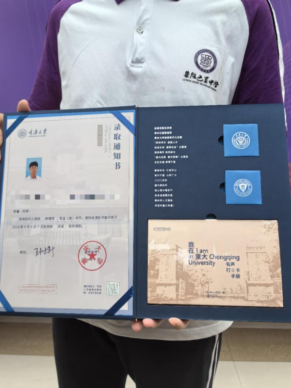 今年重庆大学录取通知书采用全新自主设计,通过“书籍”样式和各种细节,全面展示重大的精神之美、历史之美、文化之美。希望同学们从通知书里感悟家国情怀、汲取奋进力量,坚定在大学阶段学习和奋斗的志向。陈睿同学选择将重庆大学强基计划物理学专业作为第一志愿,充分体现了他对基础学科的浓厚兴趣和良好潜质。衷心祝愿陈睿同学在接下来的大学生涯中,坚定信念,挺膺担当,继续保持对基础学科的热爱与探索之心,在课程学习和科研创新训练中,既“向下沉潜”、脚踏实地夯基础,又“向上奋进”、潜心科研攀高峰,以实际行动展现重大人的青春担当。