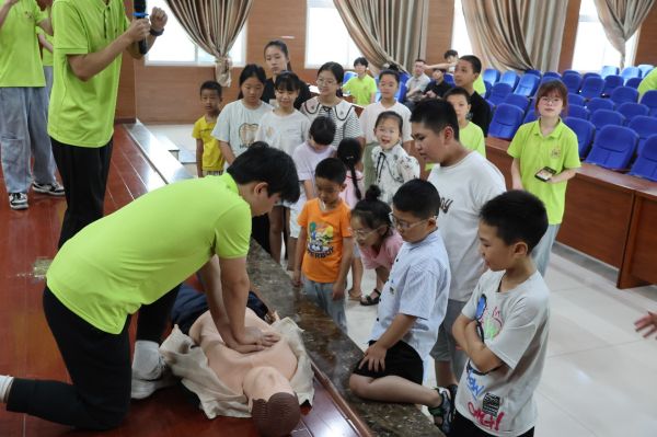 实践团的志愿者们还在两镇的青少年之家开展“安全讲堂”,通过发放安全知识手册、现场讲解、观看科普视频和现场演练等方式向少年儿童和家长们科普防溺水、安全用电、火灾逃生及灭火、心肺复苏、海姆立克急救法等知识技能,提高了他们面对应急突发事件的处置能力。
