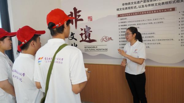重庆电子科技职业大学马克思主义学院教师彭婧结合五通村当地的酒业、桑蚕养殖业向实践团成员介绍了近年来我国乡村振兴战略取得的巨大成就,同时还结合当地的非遗文化,巧妙地用一个个传统故事带领大家一起去探寻重庆的巴渝文化,从文化传承讲到文化创新,从文化认同讲到文化自信,从对坚定文化自信的理论认知讲到坚定文化自信的社会实践,让其进一步地领会文化自信的重要性,倡导青年学生为创造社会主义文化新辉煌贡献青春力量。