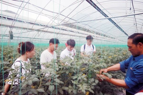 下午,实践团来到武隆高山番茄谷,进行了一场番茄绑蔓管理技术与整枝打杈技术的田间实践。