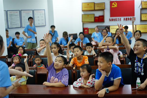 实践团成员声情并茂地讲诉着革命英雄的故事,带领孩子们回顾先辈们艰苦卓绝的峥嵘岁月。孩子们聚精会神地聆听,不时地发出惊叹,眼中闪烁着对英雄的敬佩和仰慕之情。“牛儿还在山坡吃草,放牛的却不知道哪儿去了。不是他贪玩耍丢了牛,那放牛的孩子王二小……”抗日英雄王二小的故事在《歌唱二小放牛郎》的歌谣中娓娓道来,孩子们仿佛置身于那个战火纷飞的年代,一起感受到英雄们无私奉献的精神。赵从文小朋友感叹,“今天我听到了王二小的故事,他真的好勇敢!我也要像他一样,长大后保护我们的国家。”