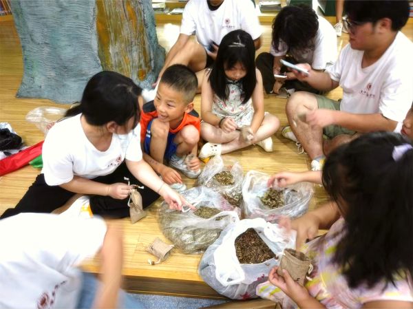 没有得到小礼品的小朋友也有机会亲自制作香囊。团队为香囊DIY环节提供了艾叶、艾绒、薄荷、藿香四味中药材,供大家选择。现场气氛活跃,笑声不断,受到了大家的一致好评!