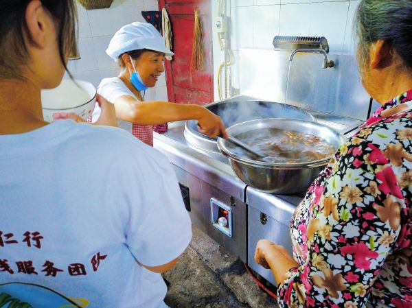 随后,实践服务队成员到厨房做准备,成员们把提前准备好的酸梅汤进行浸泡,在工作人员的热心帮助下静静地等待着酸梅汤的沸腾。随着滚烫的酸梅汤出炉,老人们迫不及待地品尝起来。
