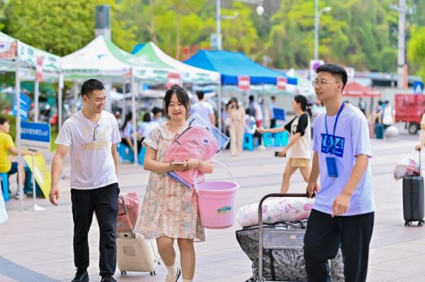 新生们满怀激情与梦想,在亲友的陪伴下,纷纷踏入这座充满生机与活力的校园,开启了他们未来四年的大学生活。“近者悦、远者来、行千里、致广大”“大学从这里开始,梦想在贸院启航”醒目的标牌、真挚的祝福语,处处洋溢着浓厚的迎新氛围。报到现场,各学院领导、老师、志愿者以热情、周到、负责的态度指引各学院新生进行报名、缴费、领取物资、寝室入住等报到流程,努力为新生营造良好的报到环境。同时,校内还安排了休息区、免费领水区、行李寄存区,为新生及家长提供便利。随处可见志愿者的身影,他们主动上前帮忙,为新生解答疑惑,让新生们感受到学校的关怀与爱护。