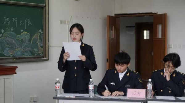 赛场上,正反双方辩手各抒己见、唇枪舌剑,展开了一场激烈的思维碰撞。正方辩手坚定地认为,自律在降低成本、提高效率、塑造良好道德情操、促进考风学风班风建设等方面具有不可替代的作用,是建设清廉航运的基石。而反方辩手则强调他律的稳定性、普遍性和强制力,认为这些特性更能确保清廉航运建设的稳健前行。