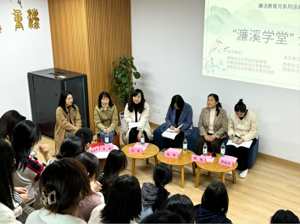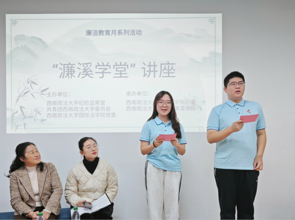 11月21日,西南政法大学青春倡廉宣讲队在西南政法大学图书馆IC共享信息空间举办了“濂溪学堂”讲座,拉开了此次廉洁教育月的序幕。西南政法大学关工委副主任耿健、纪检监察员赵玥、校团委副书记项钰然,国际法学院党委书记吕亮、国际法学院党委副书记兼纪委书记王黎、宣讲队指导老师李盈霞及全体队员参与了此次活动。