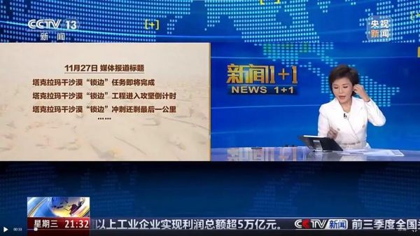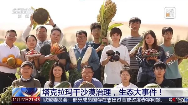 2024年11月27日,央视新闻频道新闻1+1栏目以“塔克拉玛干沙漠治理,生态大事件!”为题,采访报道了塔克拉玛干沙漠锁边工程即将顺利“合龙”的热点话题。塔克拉玛干沙漠位于塔里木盆地中央,是我国面积最大的沙漠,总面积约为33.76万平方公里,环沙漠一圈的长度是3046公里。经过40多年的治理,截至2023年底,已经构筑起一道长达2761公里的阻沙防护带,还剩下285公里缺口。眼下,这剩下的285公里“锁边”任务即将全部完成。