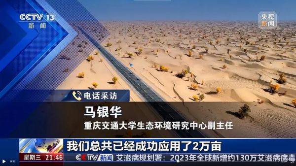 央视报道就沙漠锁边工程背后各界干部群众和科研人员付出的艰辛努力以及锁边工程对新疆未来的影响和改变,采访了多位锁边工程的亲历者和参与者,重庆交通大学沙漠土壤化技术团队成员马银华教授代表团队接受了采访。