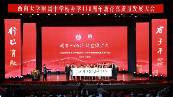立德树人,作育英才;薪火相传,蔚然于今。如今,站在新的历史起点上,西南大学附中交出了一份优异的答卷:先后荣获“中学生英才计划”十周年优秀中学、首批国家绿色学校、教育部门首批研学旅行试点学校、全国环境教育示范学校、全国国防教育示范学校、第六届“母亲河奖”“重庆市文明校园”“小平科技创新实验室”拟建学校等40多项国家级、市级荣誉;拔尖创新人才培养硕果累累,五大学科奥赛272人次获省级一等奖及以上荣誉,51人次入选重庆市代表队,6人次入选国家集训队;五育并举助力学生全面发展,今年,学校交响乐团、合唱团、武术队等多次代表重庆市参加全国性赛事荣获20余人次金奖;“党建引领教师队伍建设”成功入选西南大学“特色党建品牌”,教师平均每年获国家、市级赛课特等奖、一等奖100余人次,正高级职称评审、副高级职称评审通过人数位居重庆市前列。集团办学规模日益壮大,学校通过“U云校”,构建了由全国各地数十所学校组成的数字化教育共同体,惠及数千万名教育薄弱地区、薄弱学校的学生。
