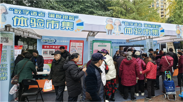 在市集现场,老年人亲身体验了智能轮椅、适老家具等数字化康养产品,并通过医疗单位提供的智慧医疗检测设备进行了健康指标的现场测试。此外,他们还体验了永辉超市手机端APP等线上购物软件,感受了智慧购物带来的便捷性。