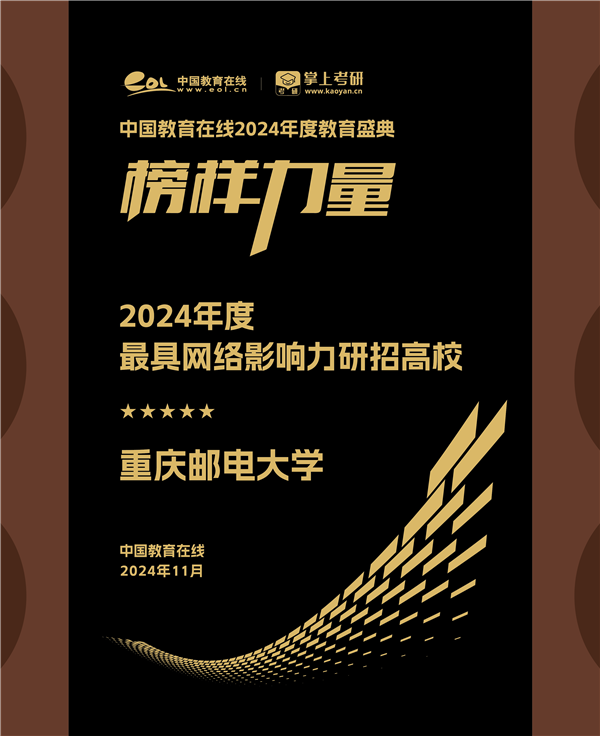 近日,必威体育登录网址 “榜样力量·2024年度教育盛典”优秀案例公布。重庆邮电大学凭借极具创新性与前瞻性的招生宣传策略,以及扎实过硬的宣传执行实力,从众多高校中突围,获评“2024年度最具网络影响力研招高校”。