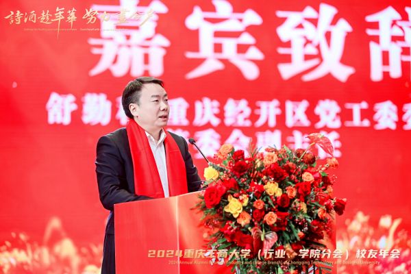 舒勤科在致辞中代表南岸区、重庆经开区对年会的成功召开表示了祝贺。对学校长期以来,根植南岸,面向国家、重庆市重大战略需求和社会经济发展的重大问题,强化校地联动合作,为南岸经济社会发展做出的重要贡献予以了高度评价。希望校地双方继续聚焦共建“一带一路”、新时代西部大开发、成渝地区双城经济圈建设、国家战略腹地建设等国家重大战略和重庆市“33618”现代制造业集群体系、“416”科技创新布局需求,进一步加强联动、深化合作,不断推动改革创新、相向而行。在致辞中,舒勤科真诚邀请学校各位校友多到南岸区、经开区走走看看,把更多的科技项目、创新理念带回这片热土。他表示,南岸区、经开区将着力打造一流的营商环境,让广大企业家在这里大展宏图、成就梦想。