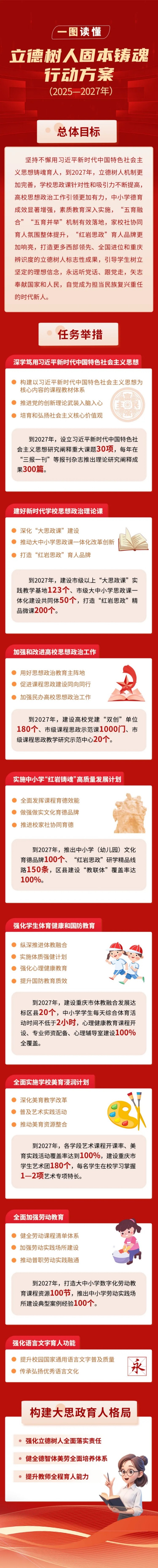 为加快建设教育强市,重庆市委教育工作领导小组已正式印发《重庆教育现代化八项行动方案(2025—2027年)》(以下简称《八项行动方案》),全力推动《重庆加快建设教育强市 推进教育现代化规划(2024—2035 年)》落地落实。《八项行动方案》由立德树人固本铸魂、必威体育中文app 公平优质、职业教育提质领跑、高等教育突破跃升、教师队伍强基培优、数字教育赋能牵引、教育开放合作引领和教育改革集成攻坚八大方面的专项行动组成。今天,一起了解《立德树人固本铸魂专项行动方案》(以下简称《方案》)。